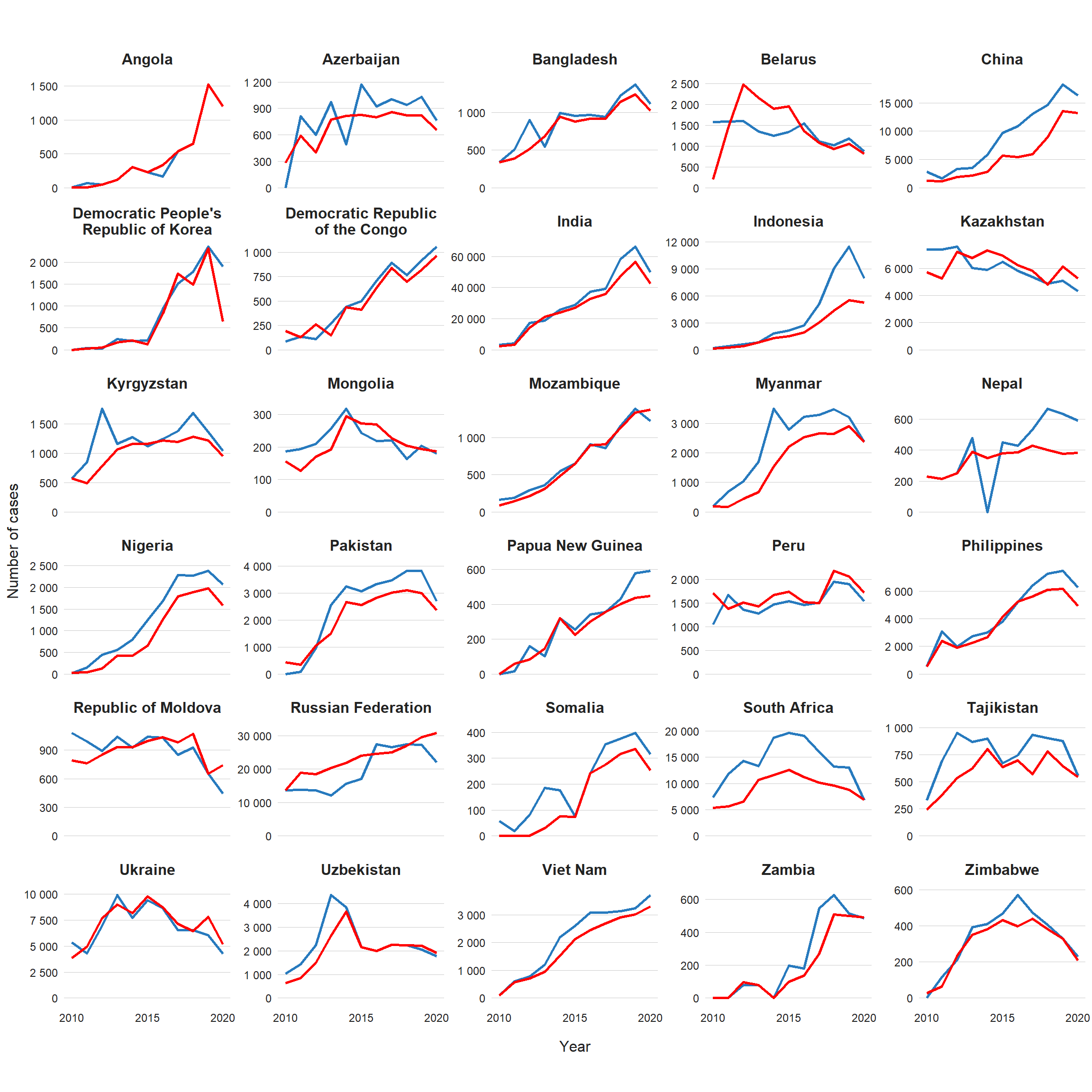 Fig. 3.4.2 Number of MDR/RR-TB cases detected (blue) and enrolled on MDR-TB treatment (red), 2010–2020, 30 high MDR-TB burden countries