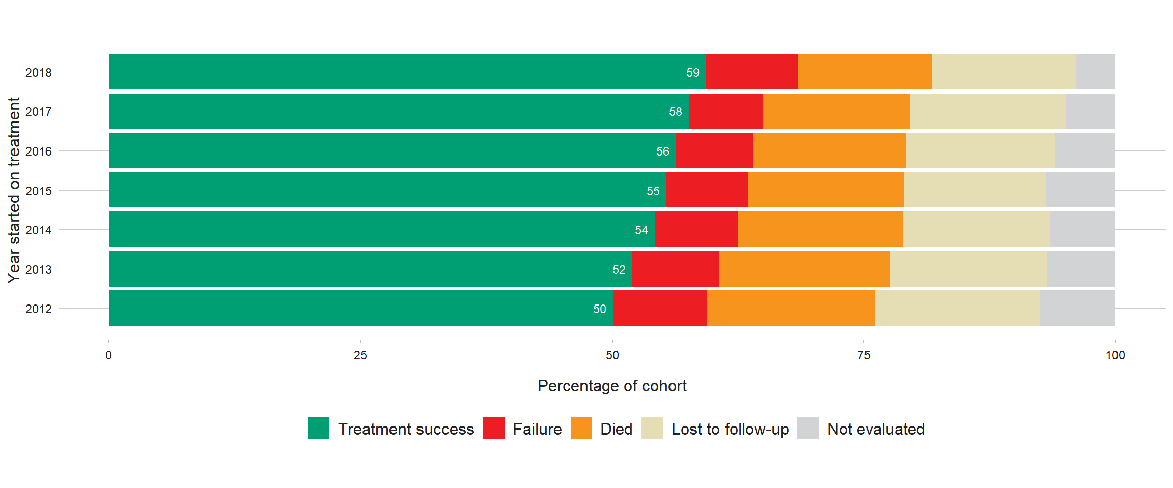 Globally in 2018 (the latest patient cohort for which data are available), the treatment success rate for people treated for MDR/RR-TB with second-line regimens was 59%; this has improved steadily in recent years, from 50% in 2012 (Fig. 3.4.4). Among WHO regions, the treatment success rate in 2018 ranged from 56% in the European Region to 69% in the African Region (Fig. 3.4.5).