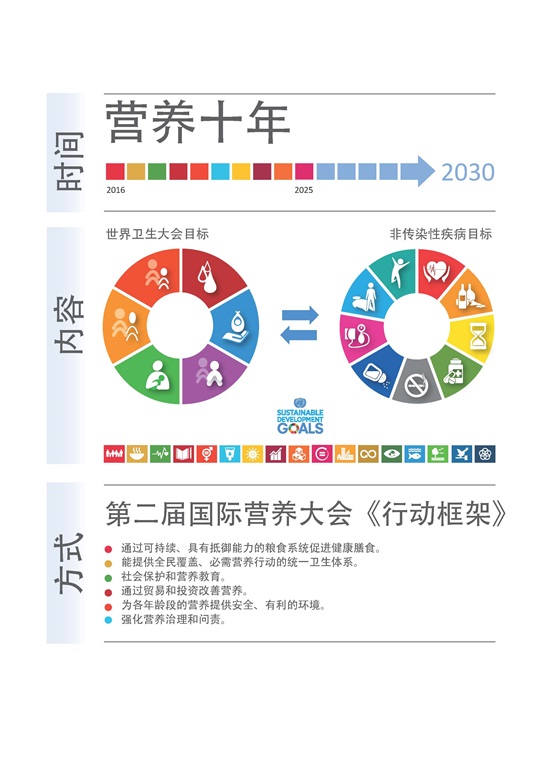 各会员国2012年在世界卫生大会决议中通过的孕产妇和婴幼儿营养全面实施计划是开展这项工作的框架。消除营养不良行动对于实现《2013-2020年预防和控制非传染性疾病全球行动计划》、《2016-2030年妇女、儿童和青少年健康全球战略》、终止儿童肥胖委员会的报告(2016年)以及《2030年可持续发展议程》中与饮食有关的目标也至关重要。